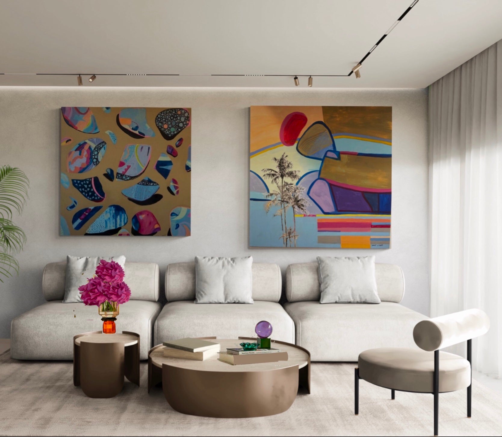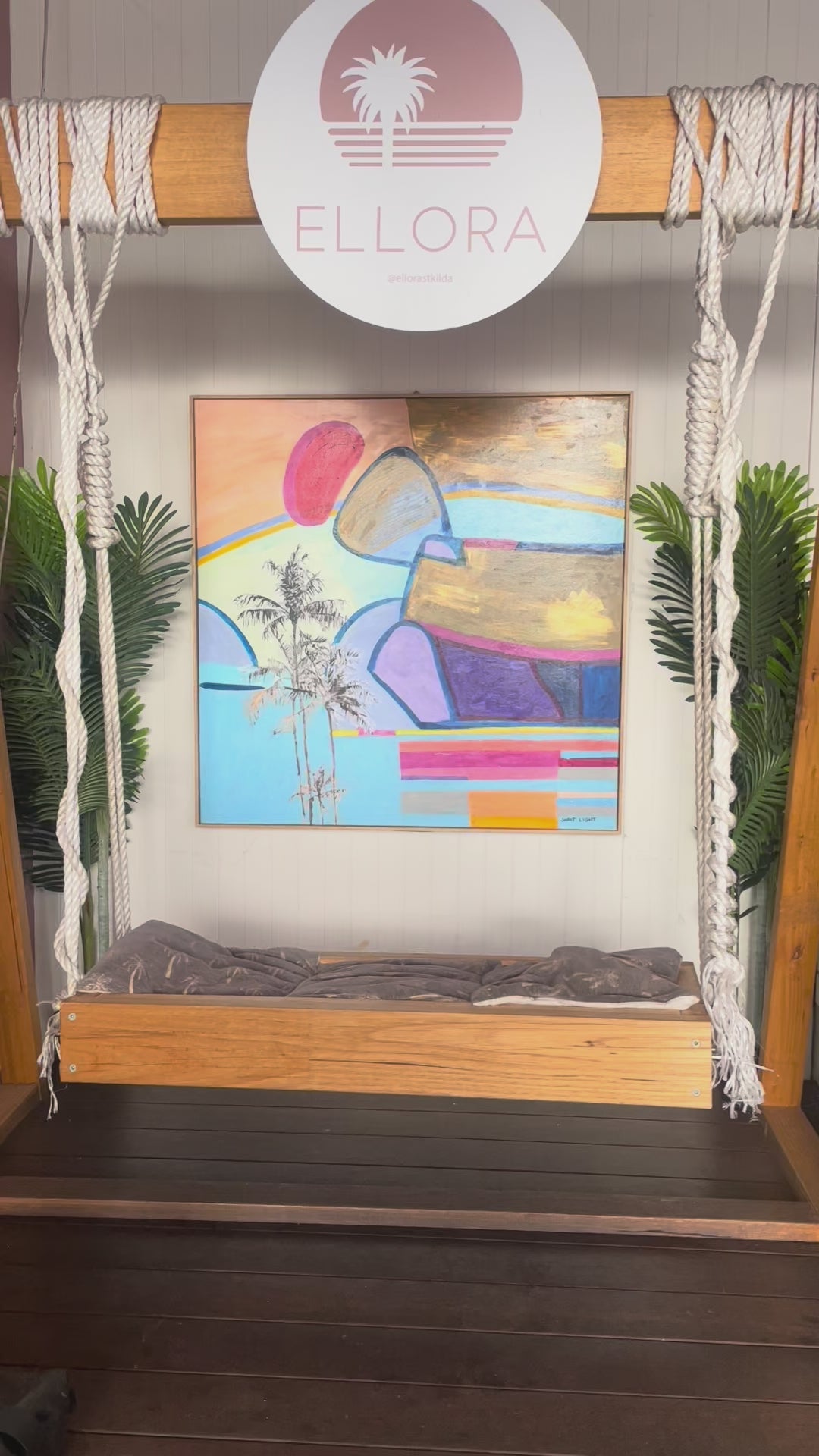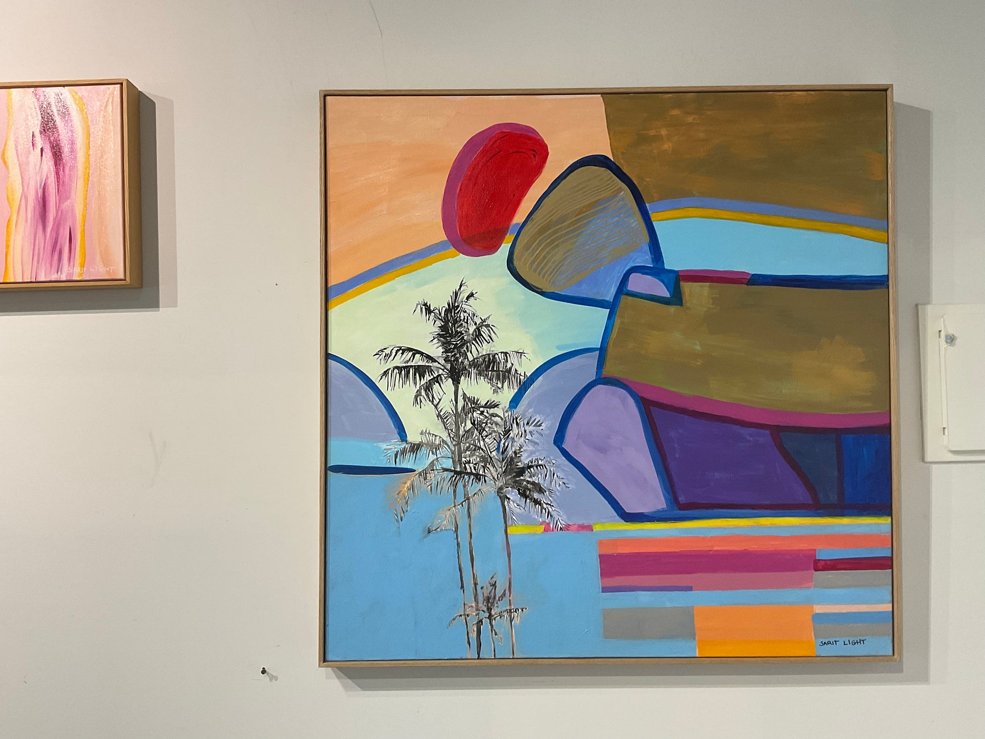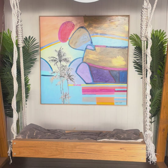 "Island Dreaming" This painting is a nostalgic reflection of a tropical island by Sarit Light. This painting is on display at Ellora in 1 Fitzroy St, St Kilda .Framed in American Oak 103cm x 103cm